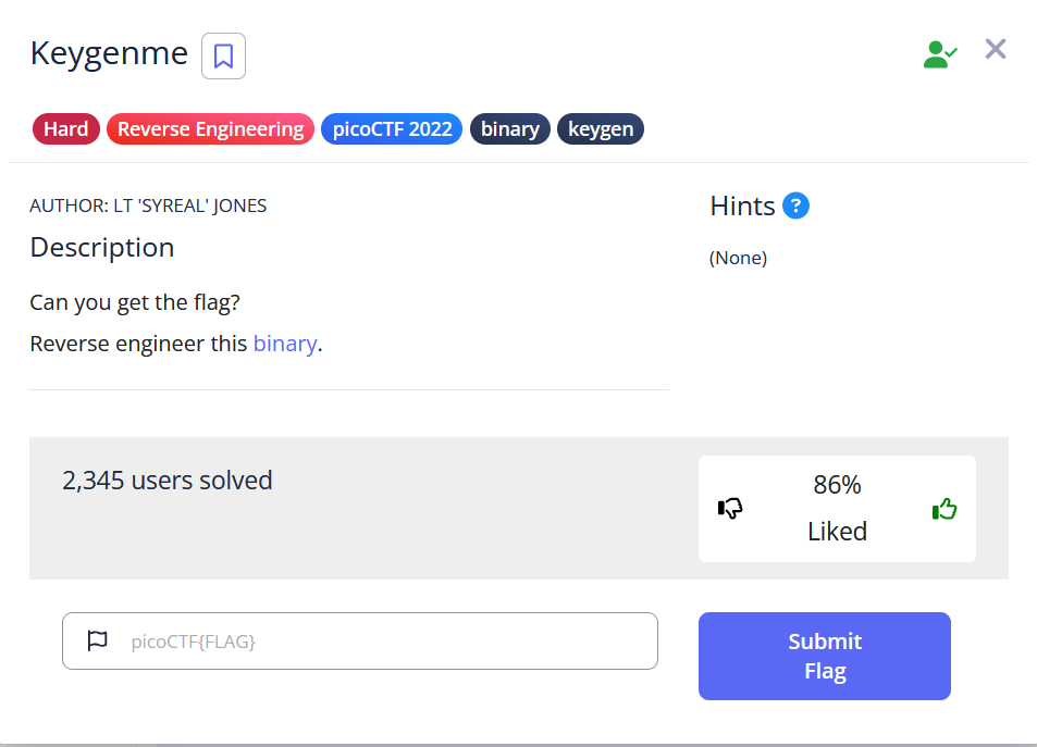 In this challenge from the picoCTF 2022 we receive a binary and a little hint from the Title of the Challenge “Keygenme”. The goal is to find the Flag which in this case is maybe a generated Key.