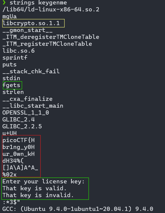 picoCTF{br1ng_y0ur_0wn_k3y_but we only see some Garbage right now. - Green: As I thought before it seems like the Program wants some Input via the fgets Function from before and this gets somehow checked and then the response is either