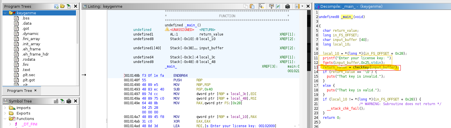 We can now clearly see the call to fgets() and the next call would be our checkKey().