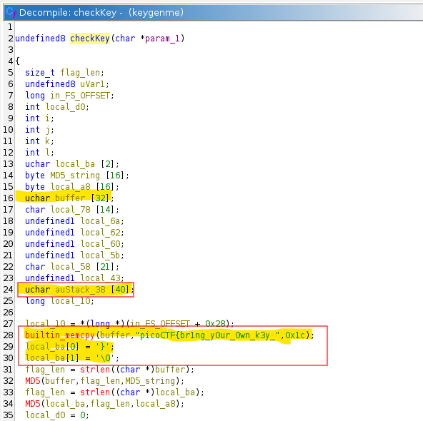 checkKey()Function. Here we just scroll down a bit to find the place that looks like the Code mentioned above. Where the Buffer is being filled. We can check how that looks like in Ghidra as well.