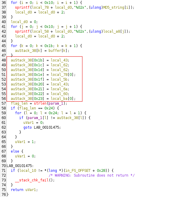 The decompiled code is a bit messy but the net effect is: positions 27..34 are filled with specific single characters taken from the hex encoded MD5 strings. The reason this looks confusing is that the compiler stored these bytes as individual stack locals, and Ghidra could not automatically re-group them into a single array. So names like local_43 and local_62 are just single bytes of the MD5 hex strings, not independent values. The decomp shows that the bytes are placed in order (using the names from the decompile)