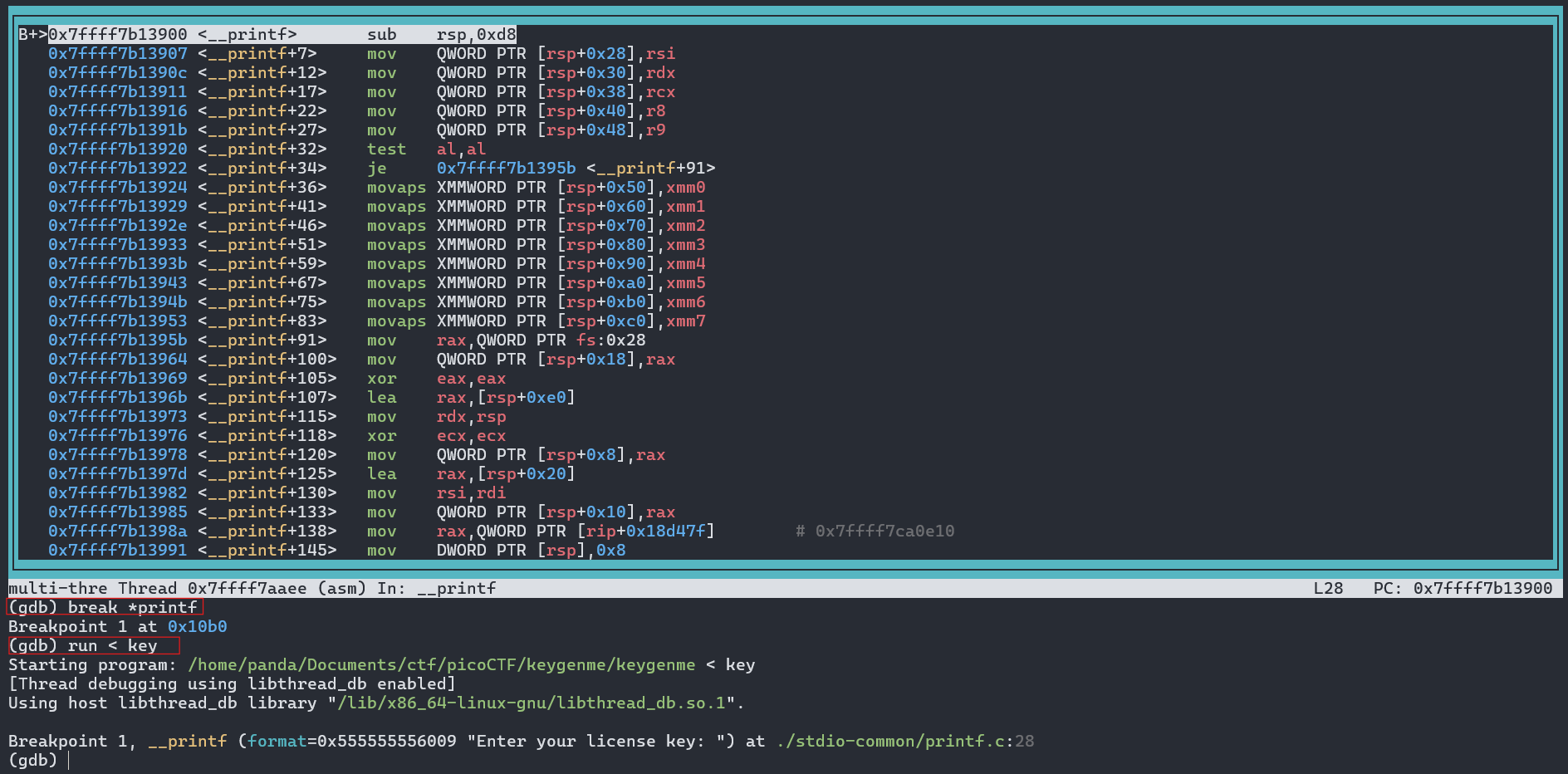 break *printfto stop on the program call toprintf(). Stopping at a libc function is useful because those symbols exist in dynamic libraries even when the binary is stripped. - Then I ran the program with Input: