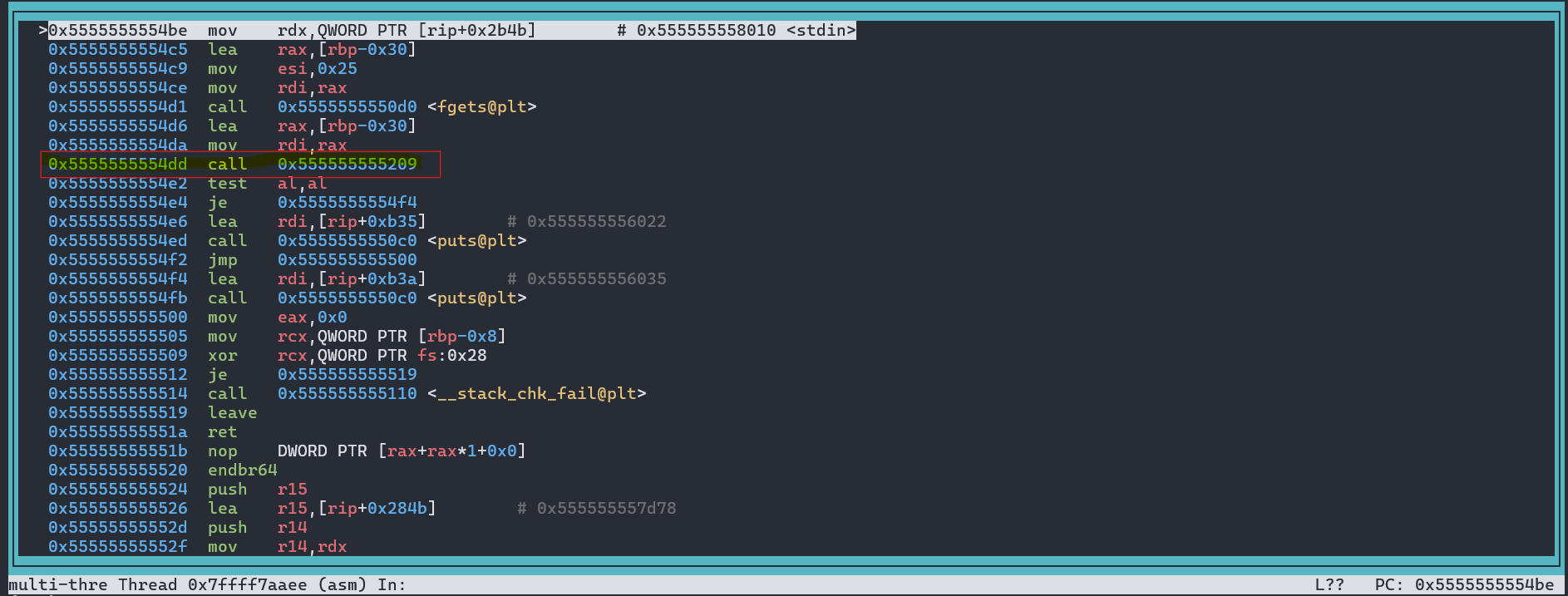 finishto step out of the library call and return to the caller. That reveals the call site inmain()and shows the instruction that calls the check routine. - Here we see something SUPER familiar. At the address 0x5555555554dd we can see a call to our